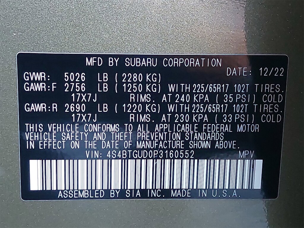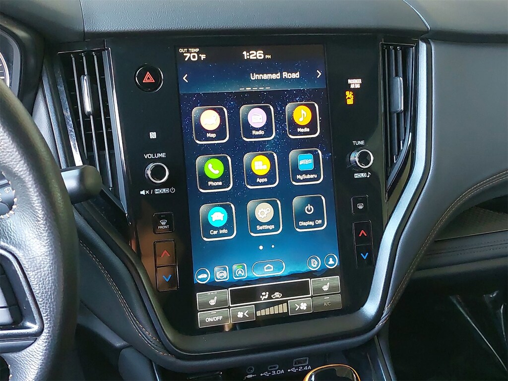 Subaru Certifed, Carfax One Owner. Power Moonroof & Navigation & RAB (Power Moonroof, Radio: Subaru STARLINK 11.6" Multimedia Nav System, and Reverse Automatic Braking (RAB) System), Subaru Certified Pre-Owned Certified, 4-Wheel Disc Brakes, 4.444 Axle Ratio, 6 Speakers, ABS brakes, Air Conditioning, Alloy wheels, AM/FM radio: SiriusXM, Auto High-beam Headlights, Auto-Dimming Exterior Mirror w/Approach Light, Auto-dimming Rear-View mirror, Automatic temperature control, Autumn Green Metallic Body Side Molding, Brake assist, Compass, Driver door bin, Driver vanity mirror, Dual front impact airbags, Dual front side impact airbags, Electronic Stability Control, Emergency communication system: STARLINK Safety Plus (3-year free trial), Exterior Parking Camera Rear, Four wheel independent suspension, Front anti-roll bar, Front Bucket Seats, Front Center Armrest w/Storage, Front dual zone A/C, Front fog lights, Front reading lights, Fully automatic headlights, Garage door transmitter: HomeLink, Heated door mirrors, Heated Front Bucket Seats, Heated front seats, Heated rear seats, Illuminated entry, Knee airbag, Leather steering wheel, Low tire pressure warning, Occupant sensing airbag, Outside temperature display, Overhead airbag, Overhead console, Panic alarm, Passenger door bin, Passenger vanity mirror, Power door mirrors, Power driver seat, Power Liftgate, Power passenger seat, Power steering, Power windows, Radio: Subaru STARLINK 11.6" Multimedia Plus Sys, Rear anti-roll bar, Rear seat center armrest, Rear window defroster, Rear window wiper, Remote keyless entry, Roof rack, Security system, Speed control, Speed-sensing steering, Splash Guards, Split folding rear seat, Spoiler, StarTex-Trimmed Upholstery, Steering wheel mounted audio controls, Steering Wheel Paddle Shift Control Switches, Tachometer, Telescoping steering wheel, Tilt steering wheel, Traction control, Trip computer, Turn signal indicator mirrors, Variably intermittent wipers, Wheels: 17" x 7J Black Aluminum Alloy, Windshield Sunshade, and Wireless Charger.